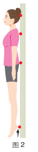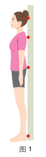“七点”是指后脑勺(枕部)、两肩、两臀、两足跟七个点位,这七处贴墙站立,两手掌心向下端平在胸前,做扩胸运动。(图1)